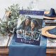 Create your own unique photo collage. Use four, 4 of your favourite photo. Personalise and add a name and age. Navy blue background, white text. The blue colour is uneven.