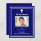 A navy blue background, decorated with a white frame, and a white cross Personalise and add a photo name and details. White text.