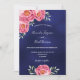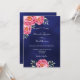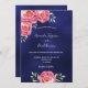 A trendy, modern wedding invitation. A dark blue navy blue background. The blue colour is uneven. Decorated with lush pink watercolored peonies flowers, florals and som grey green greenery. Templates for your names and ceremony information. The names are written with a modern hand lettered style script. White text.