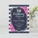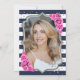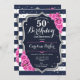 Elegant floral feminine 50th birthday invitation with your photo at the back of the card. Glam navy white pink design with faux glitter silver. Features navy blue and white stripes, baby pink roses, script font and confetti. Perfect for a stylish adult bday celebration party. Personalise with your own details. Can be customised for any age! Printed Zazzle invitations or instant download digital printable template.