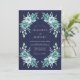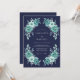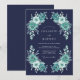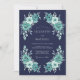 This design features a deep navy blue background paired with cool-toned floral arrangements in shades of teal and aqua. Symmetrical groupings of roses and lush peonies create an elegant and sophisticated aesthetic. Delicate leaves and botanical sprigs add a sense of movement to the polished layout. Ideal for a formal evening or winter event.