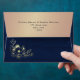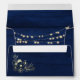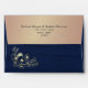 Simple, elegant, modern navy blue and rose gold 5x7 envelope with unique, sophisticated faux gold floral lace, string lights inside and return address. Perfect choice for contemporary chic weddings!