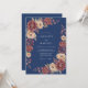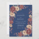 A deep navy blue backdrop sets a sophisticated stage for lush burgundy and cream roses. Muted botanical ferns and foliage sprigs create a moody atmosphere ideal for late year events. This painterly design balances rich jewel tones with delicate cream accents for an elegant and romantic aesthetic.