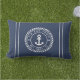 Add a cool custom touch to your fishing boat, sailboat, yacht, or houseboat with this personalised lumbar pillow. Classic nautical design in navy blue and white features your boat name and ship's registry curved inside a rope logo badge with an anchor illustration in the centre and rope stripe detailing along the sides.