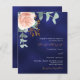 A navy blue coloured background. The blue colour is uneven. Decorated with a rose gold and blush pink floral, rose flower and green watercolored eucalyptus leaves, sprigs, greenery and a faux gold sprig. Personalise and add your names and details. White and golden coloured text.