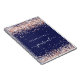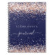 Navy blue background. Rose gold, blush confetti. The title: journal written with a girly modern hand lettered style script with swashes. White coloured letters. A notebook for journalling, notes and school homework.