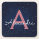 Navy Blue & Rose Gold Sparkle Monogram Initial Square Paper Coaster