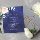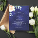 Navy blue background, the blue colour is uneven. Decorated with a rose gold and blush pink floral, rose flower and green watercolored eucalyptus leaves, sprigs, greenery and faux gold sprigs. Personalise and add your names and wedding details.