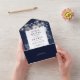 This all-in-one wedding invitation features elegant navy blue and white flowers, string lights, and modern typography. The invitation includes a perforated RSVP card that can be individually addressed or left blank so you can handwrite your guest's address details. Designed by Thisisnotme©