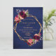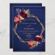 A rustic country style wedding invitation. A faux gold geometric frame with watercolored feathers and florals in burgundy, pink and rose gold. Personalise and add your first names and wedding details. A dark navy blue rustic wooden barn wall as background. Golden letters.