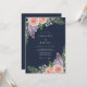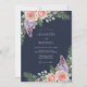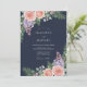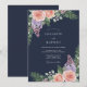 This design features a deep navy blue background contrasted with delicate peach roses and clusters of purple lilacs. Verdant evergreen pine branches and lush foliage add a touch of nature to the winter-inspired colour palette. The overall mood is sophisticated and romantic, perfect for a seasonal cold-weather ceremony.