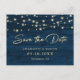Navy Blue Rustic Wood String Lights Save The Date Announcement Postcard