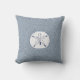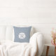 Beach decorative throw pillow in a navy blue and white sand dollar design. Pillow design is a faux weave pattern in navy blue with a navy blue and white sand dollar design in the centre. The backside of the pillow is faux weave pattern design in coordinating navy blue.