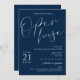 Create elegant business real estate event invites for your house warming or new business party with this navy blue and silver Open House Invitation. This professional dark blue and faux silver open house event invitation features a modern layout with calligraphy script font and space for your logo and event details, perfect to invite guests to your Housewarming Celebration or Open Day Event.