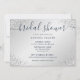Elegant navy blue and silver bridal shower invitation featuring a modern script font and silver confetti. Matching items available.