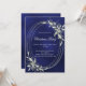 A blue, uneven coloured background. An oval faux silver frame decorated with sage green greenery. Personalise and add the details. White text.