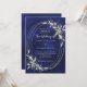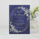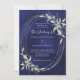 A blue, uneven coloured background. An oval faux silver frame decorated with sage green greenery. Personalise and add your names, details. Black text.