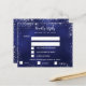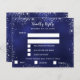 A navy blue background, the blue colour is uneven. Decorated with faux silver glitter, sparkles. Personalise and add the reply by date and dinner menu choises.