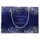 A navy blue background decorated with faux silver confetti, sparkles. The blue colour is uneven. Personalise and a date, and the bride and goom's names.
