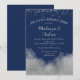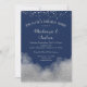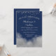 An elegant navy blue and silver wedding rehearsal dinner invitation featuring silver glitter confetti dust and silver bling at the bottom.