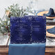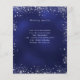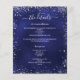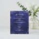 A modern, elegant wedding program/details/timeline. A navy blue coloured background decorated with faux silver glitter sparkles. The blue colour is uneven. Personalise and add your names and wedding details. White coloured letters.