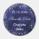 A Save the Date magnet for your wedding guests. A navy blue background, white text. The blue colour is uneven. Decorated with faux silver sparkles. Personalise and add your names and wedding date.
