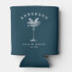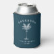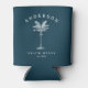 Navy Blue Simple Palm Tree Beach House Can Cooler features a vintage palm tree illustration, along with your last name.
