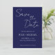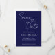 Simple style wedding save-the-date invitations that feature white, stylised script on a trendy, navy blue colour background. Edit and replace names, date, and location with your own. Select your invitation size and paper style.
