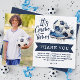 Modern , trendy sporty and dynamic photo soccer / football kids birthday thank you cards, perfect for young soccer enthusiasts. Design features typography script '' its game time'' , watercolor illustration with a soccer ball and shoes in trendy blue colours, single photo and thank you message in bold lettering. With editable features, you can effortlessly personalise the thank you card with your child's name and message or additional text.