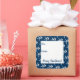 Starfish Christmas stickers for wrapping gifts. Navy blue colour with pattern of white sea stars this square sticker comes in two sizes. Customise text to say “Merry Christmas” or other greeting. A white square panel in the centre is blank for names.