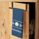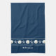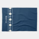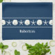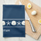Perfect for coastal bathroom décor, this personalised beach themed kitchen towel features a row of white sand dollars and starfish, with the name underneath, on a navy blue background.
