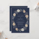 This design features a deep navy blue background that provides a striking contrast for the soft botanical elements. A delicate arrangement of creamy white roses and muted peach blossoms is intertwined with silvery eucalyptus leaves and dainty berry sprigs. The colour palette creates a sophisticated mood perfect for a formal winter or evening event. The hand-painted watercolor style adds a touch of timeless elegance to the floral display.
