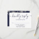 A stylish RSVP card with your details set in chic typography and personalised with your names, hand-drawn floral foliage, and string lights on a navy blue background on the reverse. Designed by Thisisnotme©