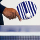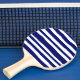 Navy striped on white ping pong paddle.