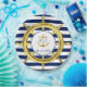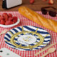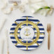 Continue the nautical stripes wedding theme with the matching paper plates. A gold ship’s wheel is striking against the classic navy blue and white stripes. In the centre is a gold anchor with the monograms of the bride and groom, and the wedding date.