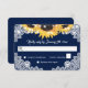 Elegant navy blue and sunflower rustic floral wedding RSVP card featuring sunflowers, white floral lace and string lights against a burlap background. Perfect card design to complement your navy blue rustic wedding party inspired by sunflower flowers.