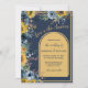 This stunning wedding invitation features a navy blue background with luscious sunflowers and surrounded by lighter blue flower and greenery. Gold lettering and touches of calligraphy are a perfect accompaniment to the beautiful flowers. A lovely design choice to set the tone for your wedding celebration. There are card variations and a matching envelope. For any design question or additional customisation and / or matching items, just send an email to charmdesignstudio@rcn.com and we'll be delighted to assist.