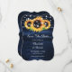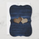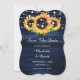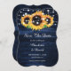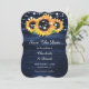 Rustic navy blue and sunflower wedding save the date cards featuring sunflowers on a wood background adorned with string lights. Two burlap hearts at the back. Matching items available.