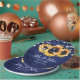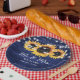 Navy blue and sunflower wedding paper plates featuring sunflower flowers and string lights on a barn wood background. Matching items available.