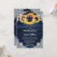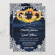 Elegant rustic navy blue floral wedding invitation featuring sunflowers against a wood background adorned with white floral lace and string lights. Ideal card design for a romantic navy blue rustic wedding party inspired by sunflower flowers.