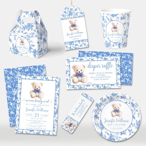 Explore the sophistication of a seamless navy blue chick floral pattern in this elegant baby boy shower invitation, adorned with a charming blue teddy bear. Join the excitement of the "We can bearly wait" baby shower theme. Elevate your celebration with this stylish and adorable invitation that captures the anticipation of the upcoming arrival.