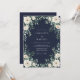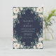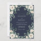 This design features a deep navy blue background that creates a striking contrast for the creamy white roses and lush greenery. The botanical arrangement includes delicate eucalyptus leaves and verdant foliage, offering a classic and sophisticated aesthetic. Ideal for a formal evening event, the mood is one of timeless elegance and moody romance.