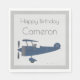 This stylish custom party napkin features a soft grey coloured frame with a white centre. An image of a vintage air plane is printed in the centre in a navy blue colour with accents of grey. A sample pilot name is printed above the plane with a happy birthday message. You can personalise the napkin with your own name, child's name, or other custom message or quote.