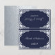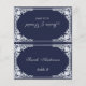 A vintage navy blue wedding place card with the guest name and the table number printed on its front and the bride and groom names and the wedding date printed on the other side (that is the other half, before folding it). It has an antique frame with faux silver foil decorations and also faux silver inside (on the back, before folding it). All text is grey, written in elegant calligraphy. The background is navy blue.