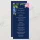 This wedding program card features a top border of pretty flowers in colours of violet pink and blue nestled among green leaves. Your custom text is in white at the centre, on a dramatic dark navy blue background. The back of the card is solid matching navy blue. This program card is versatile enough to be used for a variety of events, especially in the spring and summer. It has matching wedding invitations and other wedding products in our store.