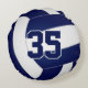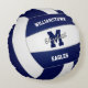 This team colours volleyball round throw pillow features the realistic image of a volleyball that has navy blue and white panels, upon which you can customise the player's name, monogram or varsity letter, team and mascot name on the front and jersey number on the back - by katz_d_zynes