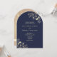Enhance your wedding experience with this timelessly elegant rose gold and navy blue invitation, showcasing a refined arched design and luxurious gilded gold floral details. Featuring a convenient QR code for effortless RSVPs and direct access to your wedding website, this chic invitation combines classic sophistication with modern practicality.