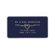 Simple, minimal, modern calligraphy navy blue wedding return address label with gold rope heart.