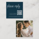 Make your wedding RSVP process seamless, with our RSVP QR code enclosure card. This compact customisable card features modern white lettering with a chic navy blue background. The front includes a customisable text area and a space to generate a unique QR code for guests to easily RSVP through their smartphones. Go the the "personalise" option, add your wedding website URL to the area provided, and a QR code will generate on the design just for you. On the reverse side, add a personal touch with a photo. Make your special day even more memorable with this chic and functional wedding enclosure card.