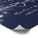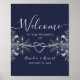Elegant modern navy blue wedding welcome poster with simple silver rope heart and gilded floral lace.